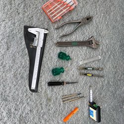 Ett varierat urval av verktyg för olika projekt. Inkluderar skruvmejslar, nycklar, tänger, hammare och andra handverktyg.