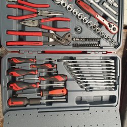 Verktygssats med diverse verktyg som skruvmejslar, hylsnycklar, tänger, isoleringstejp och kabelskotång.