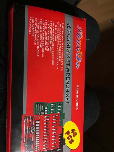 46 delars hylsnyckelsats innehållande: 21-bit hylsor: SL4,5.5,7 PH1,2,3 PZ1,2,3 HEX3,4,5,6,7,8 T10,15,20,25,30,40 13-1/4"DR hylsor: 4,4.5,5,5.5,6,7,8,9,10,11,12,13,14MM 3-Hexnycklar: 1.5,2.0,2.5MM 1-1/4"DR Universal Joint, 1-1/4"X2" förlängningsarm, 1-1/4"X4" förlängningsarm, 1-1/4"X6" flexibel förlängning, 1-1/4"DR glidande T-stång, 1-1/4" snabbspärrhandtag, 1-6" spinnarhandtag, 1-bit adapter, 1-blåsformad väska