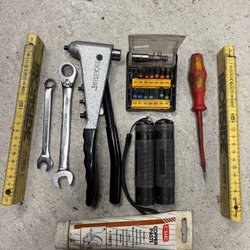 Ett sortiment av verktyg, inklusive skruvmejslar, tänger, nycklar, hylsor och en borrmaskin med tillbehör. Förvaringslådor i olika färger ingår.allt i osorterat skick men mycket nytt! Plocklådorna har varit monterade direkt på vägg där av inga monterings skenor som brukar följa !hylsorna är nya o blandade storlekar!