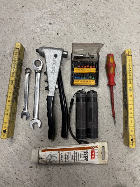 Ett sortiment av diverse verktyg. Inkluderar bland annat: Ironside popnageltång, skruvmejsel, ringnycklar (10 och 13 mm), bits-set, CRC kopparpasta och två ficklampor samt två tumstockar.