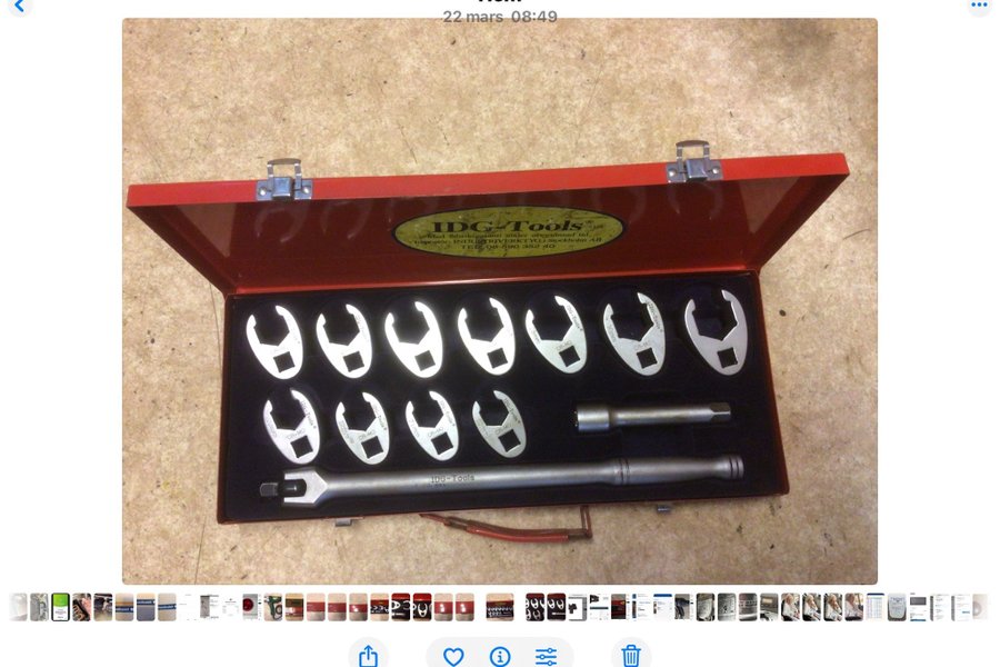 Verktygssats från IDG-Tools. Innehåller ringnycklar i olika storlekar samt förlängningshandtag. Tillverkad av CR-MO.