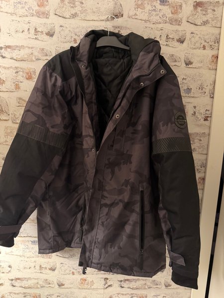 Grå kamouflagefärgad jacka med svarta detaljer. Jackan har en huva och stängs med dragkedja och knappar. Det finns fickor på framsidan.