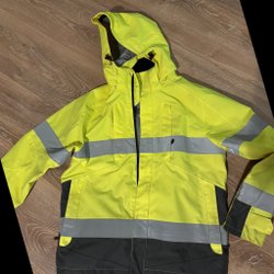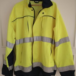 Gul jacka med reflexdetaljer och svarta detaljer som dragkedjor och muddar. Jackan har en hög krage och stängs med dragkedja.