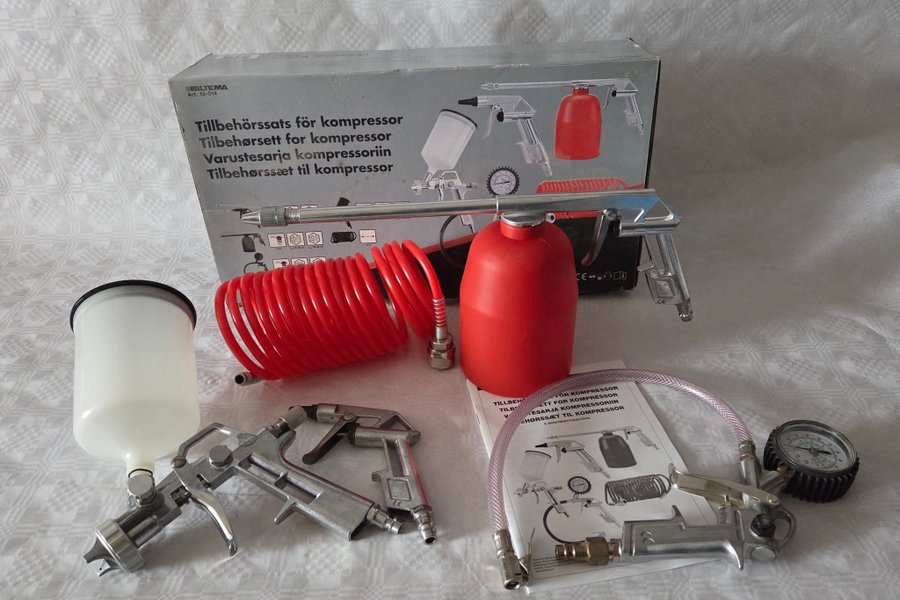 Kompressortillbehörssats. Satsen innehåller en färgspruta, en blåspistol, en däckpåfyllare med manometer, en spiralslang och en sprutpistol med behållare.