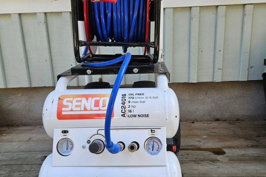 SENCO AC24016 oljefri kompressor med en kapacitet på 170 l/min vid 6 bar och ett maximalt tryck på 9 bar. Motorn är på 2 hk och tanken rymmer 16 liter. Kompressorn är designad för låg ljudnivå.