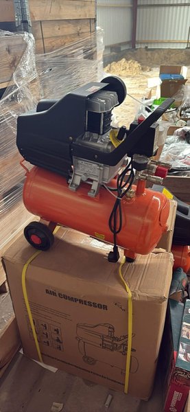 Luftkompressor med hjul for nem transport. Den har en orange tank og en sort motor. Kompressoren er udstyret med en strømkontakt og trykmålere.