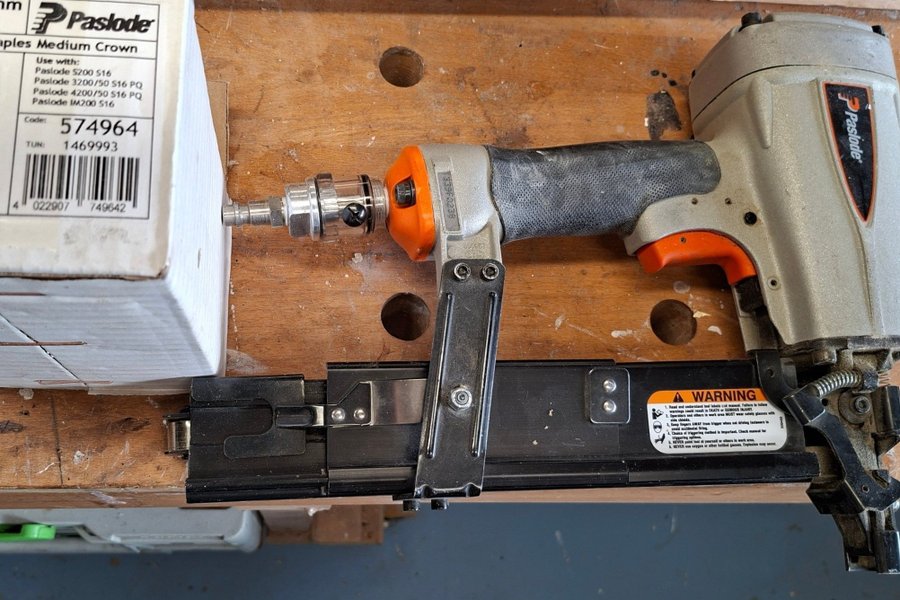 Paslode dyckertpistol med tillhörande Paslode klammer (Medium Crown). Klammern är avsedd för Paslode S200 S16, Paslode 3200/50 S16 PQ, Paslode 4200/50 S16 PQ och Paslode IM200 S16.