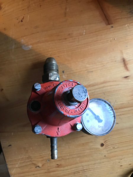 Gasregulator för gasol eller liknande gaser. Regulatorn är röd och har en manometer för tryckavläsning. Den har anslutningar för inkommande och utgående gas.