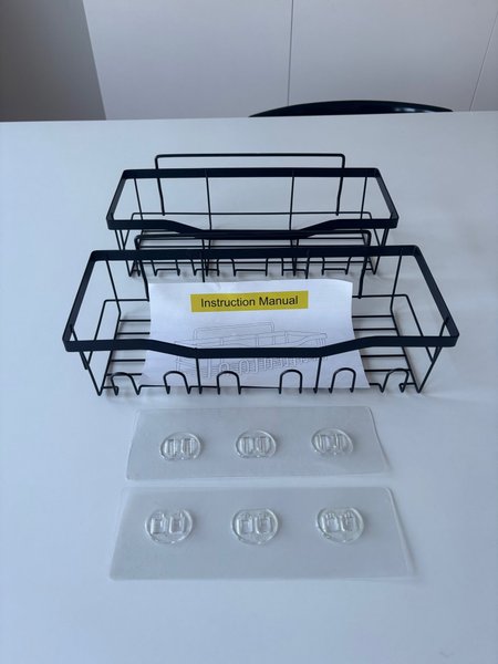 Två duschkorgar i metall. Monteras med självhäftande fästen. Instruktionsmanual medföljer.