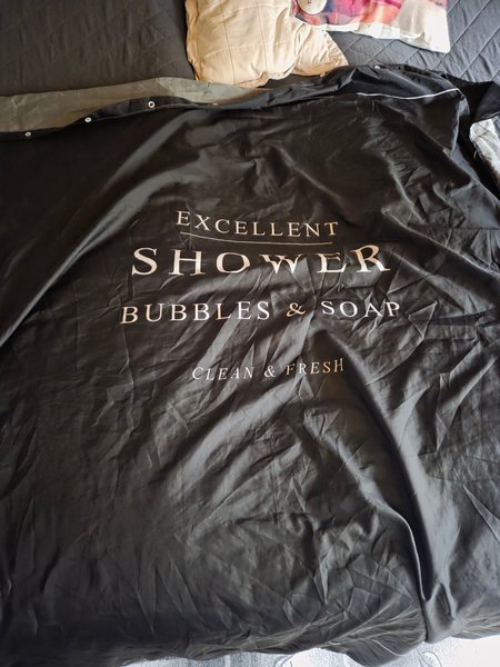 Svart duschdraperi med texten "Excellent Shower Bubbles & Soap Clean & Fresh".