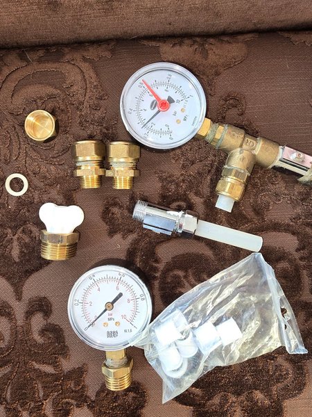 Vattenmätare med tillhörande kopplingar och tillbehör. Inkluderar två tryckmätare, en med märkning Brannan och den andra med MEC. Även diverse mässingskopplingar och en påse med vita plastdelar ingår.