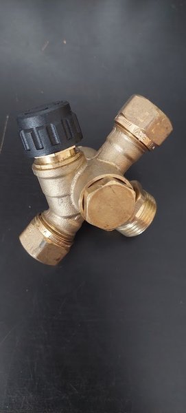 Esbe blandningsventil med tre anslutningar. Ventilrör med anslutningar för säkerhetsventil, avtappningsventil, påfyllningsventil och vakuumventil i tappvatteninstallationer.