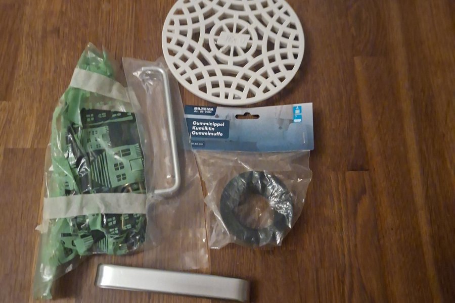 Diverse VVS-delar enligt bild. Innehåller bland annat gumminippel, gummimuffe, handtag och annat.