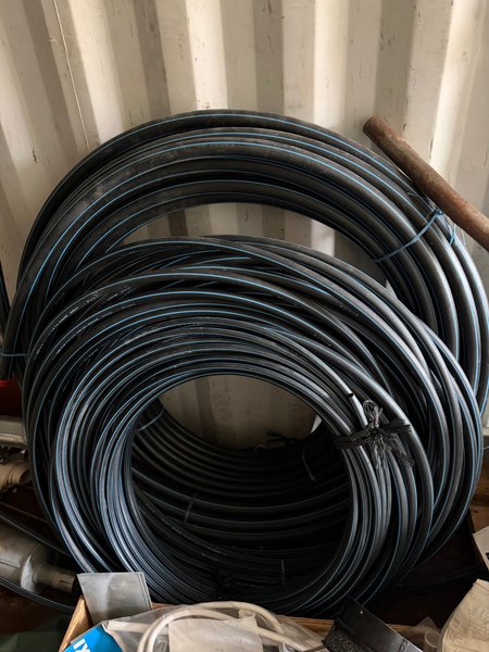 Svart PEM-slang med blå ränder, upprullad i en cirkelform. Flera buntar i olika storlekar. okänt antal meter. Nya.