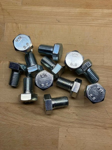 Bultar M20×30 märkta med 'VW' och '8.8' på huvudet. De är av metall och har gänga.