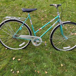 En klassisk damcykel med ett vintage look. Utan växel. Den kommer med pakethållare, två kombinationslås, belysning, klocka och sadelskydd.