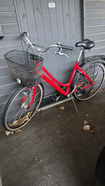 Röd Monark damcykel. Ytterst begränsat använd, men i starkt behov av tvätt och lite olja efter två år i en carport. Två nycklar och ett extra vajerlås.