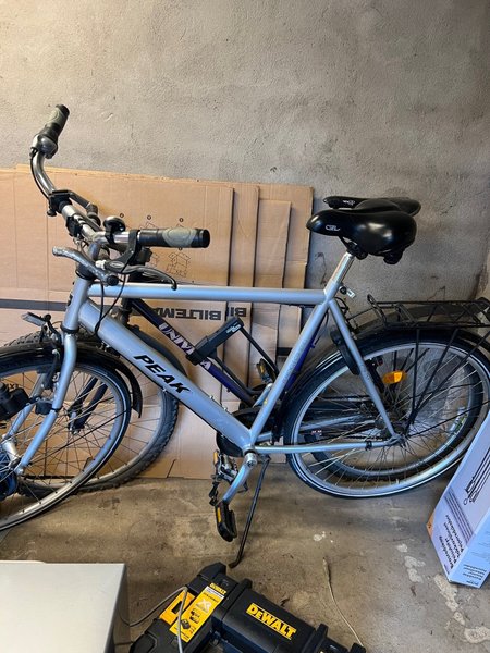 Peak cykel i modell CTB-7M. Cykeln har en pakethållare bak och en GEL-sadel. Båda däcken är punktering på.