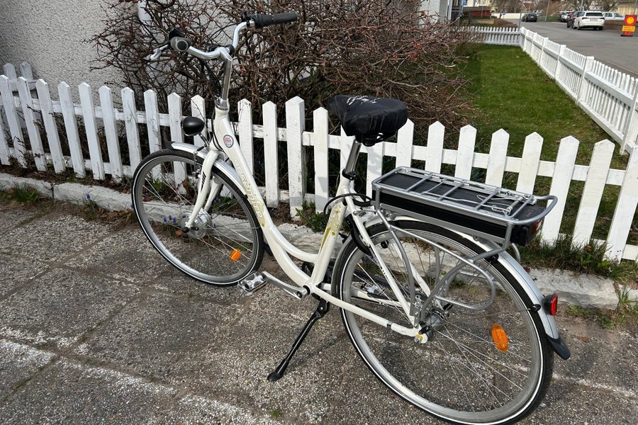 Elcykel från Yosemite. Cykeln är vit med en svart pakethållare baktill. Den har en svart sadel med ett svart överdrag. Cykeln har skärmar över båda hjulen och en cykelstöd.