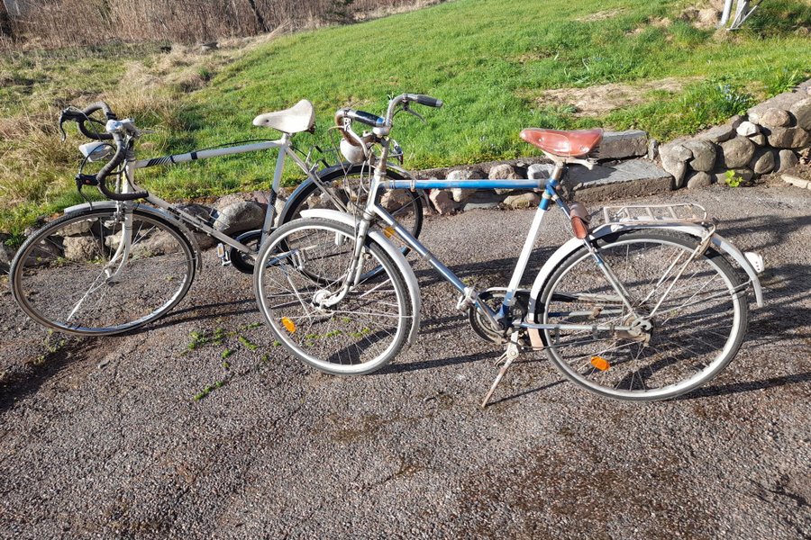 Två cyklar säljes, en vit och en blå/vit. Båda cyklarna har pakethållare och skärmar. Den vita cykeln har bockstyre och den blå/vita cykeln har ett klassiskt styre.