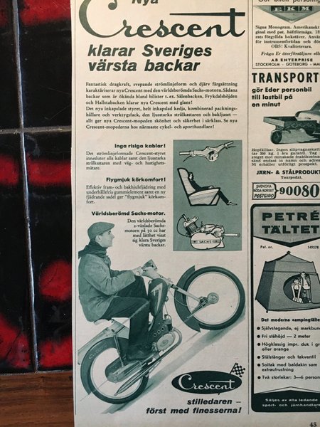 En annons för Crescent mopeder. Den beskriver mopeder med strömlinjeform och Sachs-motor. Annonsen framhäver inkapslat styre, kedja och kombinerad packningshållare. Den har även ljusstark strålkastare och bakljus.