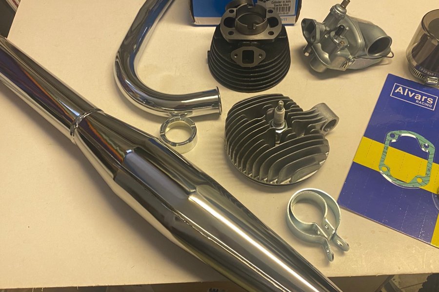 Cylinder 60cc med kolv, topplock NTS högkomp. Med tändstift NGK B9ES, förgasare 17mm kyrkport, komplett avgassystem 32mm, packningar, luftfilter, avgasklammor,