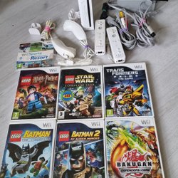 Nintendo Wii konsol med två handkontroller, nunchuck, sensor bar, strömadapter, AV-kabel, Wii2HDMI adapter, två rattar och sex spel: Super Mario Galaxy 2, Donkey Kong Country Returns, Lego Star Wars The Complete Saga, Cars, New Super Mario Bros Wii och Mario Kart Wii.