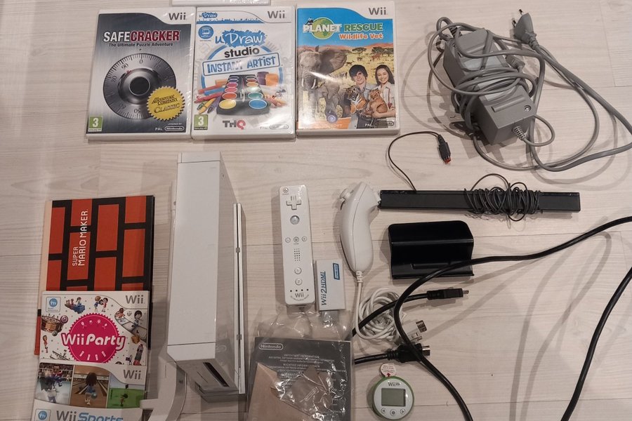Nintendo Wii konsol med tillbehör och spel. Inkluderar Wii-konsol, handkontroller, sensorer, strömkabel, Wii Fit Meter, spelen Wii Sports, Wii Party, , Safecracker, uDraw Studio Instant Artist, Planet Rescue Wildlife Vet och Truth or Lies Hör av er om det är nått ni undrar över jag har bara startat det . Det som är på bilder är det som hänger med super Mario maker är nog bara en bok Mvh Mats