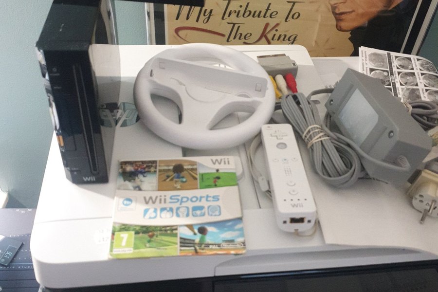 Svart Nintendo Wii med sensor-bar, AV-kabel + scart-adapter och nätadapter