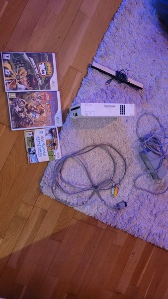 Nintendo Wii konsol med strömkabel, sensor bar och AV-kabel. Inkluderar spelen Wii Sports, LEGO Indiana Jones och Ben 10 Protector of Earth.