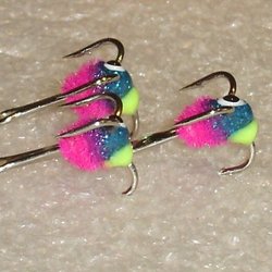 Tre pimpelkrokar strl 8 i modellen "Chenillekrokar" bundna och limmade på krokar i high carbonsteel. Alla krokarna är i samma mönster/färgkombination. Mycket bra krokar till fisket efter den större abborren!!!