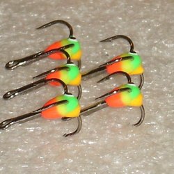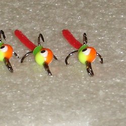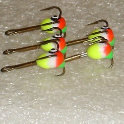 Tre pimpelkrokar i strl 10 limmade på krokar i high carbonsteel. Alla krokarna är i samma mönster/färgkombination. Mycket bra krokar till fisket efter den större abborren!!!
