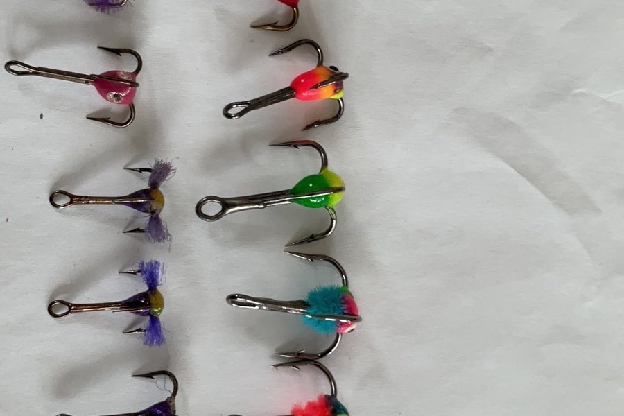 Pimpelkrokar i storlek 12/10/och 8 passar till lite större abborre,dom flesta oanvända.Se mått på linjalen för referens.