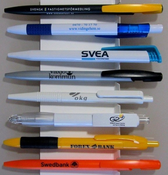Reklam/kulspetspenna – 8 st.: Svensk fastighetsförmedling, Vidingehem, SVEA, Växjö kommun, okg, G2, Forex Bank, Swedbank.