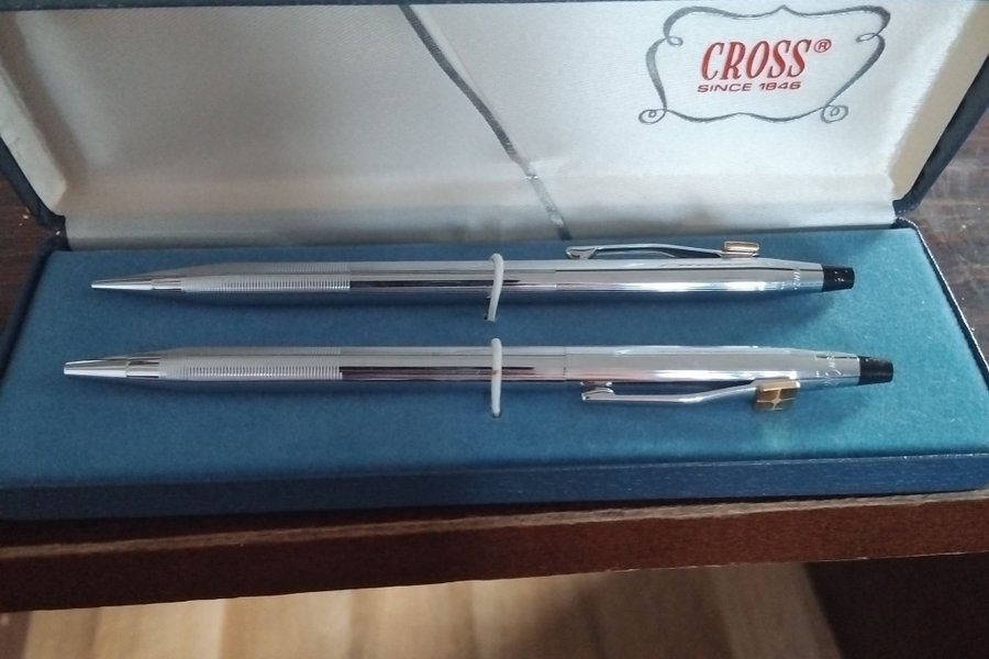 Två SUPERFINA, ALDRIG använda Cross pennor. En blyerts och en bläck. Har säkerligen minst 40 år på nacken.