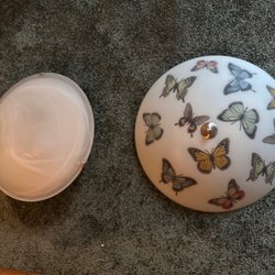Två taklampor säljes. En äldre modell med blommor och guldfärgad kant. Den andra är en nyare modell i vitt med sensor.