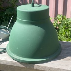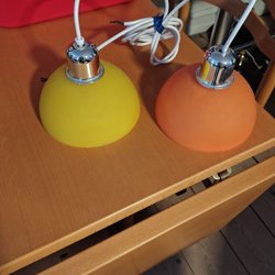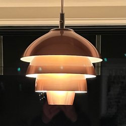 vintage lampe fra 70 erne med alu skærm og detaljer i rød og messingfarve. Lampen har en hvid ledning og en grøn kontakt lampen har patina og små ridser men er ellers fin.