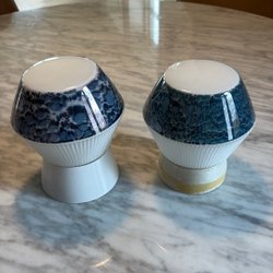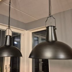 Två taklampor med svart metallram och glas.