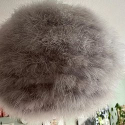 Fjäderlampa i grå nyans. Lampan är designad för att skapa en mjuk och inbjudande atmosfär i rummet.