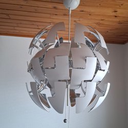 Produktbeskrivning: Det är en stilren, vit takpendel med en diameter på 50 cm och en höjd på 26 cm. Den är designad för att ge ett riktat ljus nedåt, vilket gör att den passar bra över till exempel ett matbord.
