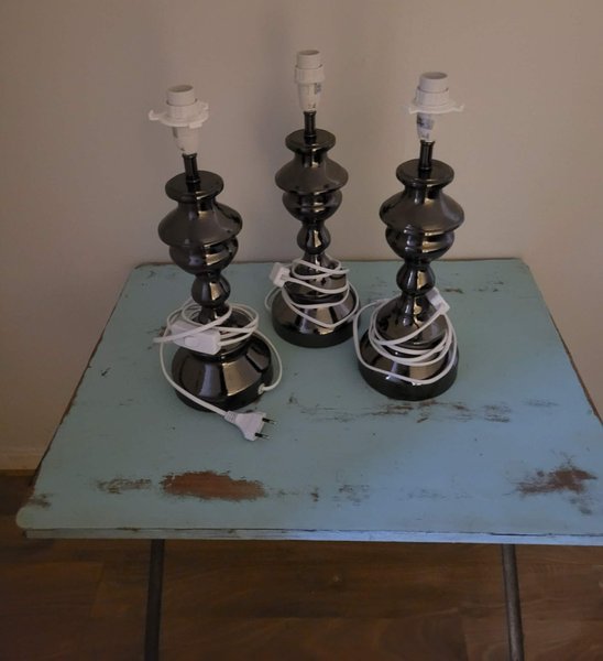 Tre bordslampor med sladd och strömbrytare. Lamporna är utan lampskärm.