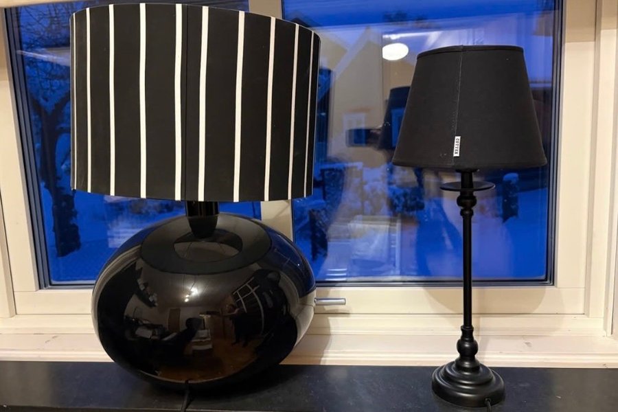 Två bordslampor i svart utförande. En lampa med randig lampskärm och en mindre lampa med klassisk design. Säljer bägge tillsammans för 200kr.