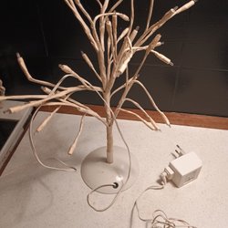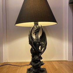 En lampa med en unik design. Den har ett handtag för enkel transport och en strömbrytare för att tända och släcka ljuset. Lampan har en silverfärgad bas och en genomskinlig kupol.