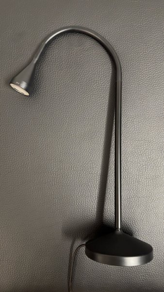 Svart bordslampa med böjbar arm. Lampan har en stabil bas och en integrerad LED-ljuskälla på 1.9W.