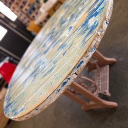 Stabilt brunbetsat bord från 40-talet. Vacker utskärning på kortsidorna. En liten glipa i bordsskivan (se bilder). Mått: L=130cm B=70cm H=73cm