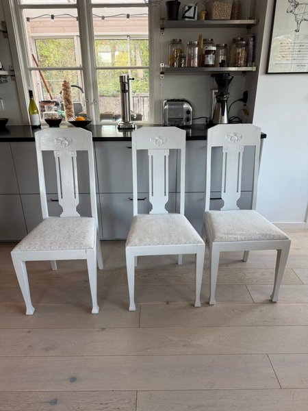 3 gedigna stadiga trästol design äpplet. Tyget på kan behöva bytas pga nån mindre fläck stolar i övrigt toppen skick.