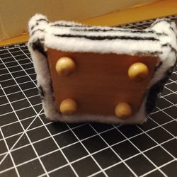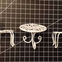 Bord och pallar till pub/ bar miljö.Trä med klädda sitsar. Jag har själv klätt pallarna. Passar storlek 1:12. Rutorna är 1 cm för referens till storlek.
