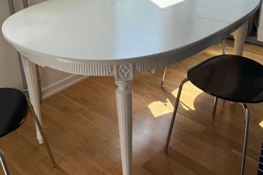 Ett vitt målad Gustaviansk matsalsbord . Bordet i massiv trä. Använd skick. Storlek ca 140x100 cm. Inga ilägg skivor.