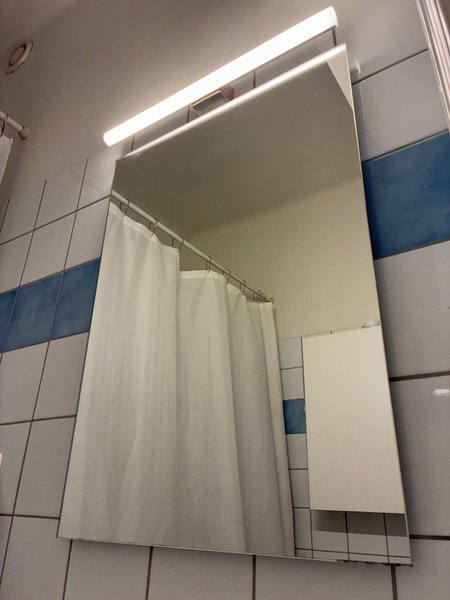 Spegeln är designad för att monteras på väggen utan synliga fästen och passar väl in i de flesta badrumsmiljöer.